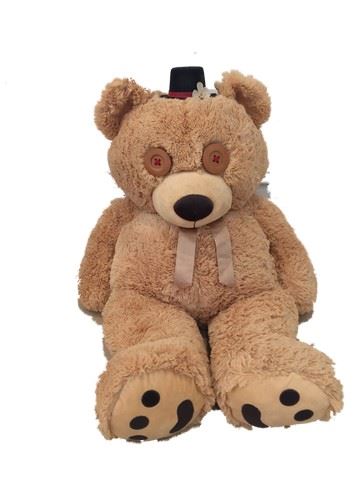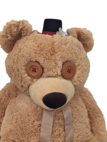 Screen used, set decoration, large plush teddy bear with a satin tie and a black top hat with a flower, the teddy has two large button eyes with red stitching. (34x19)