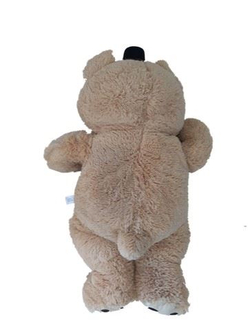 Screen used, set decoration, large plush teddy bear with a satin tie and a black top hat with a flower, the teddy has two large button eyes with red stitching. (34x19)