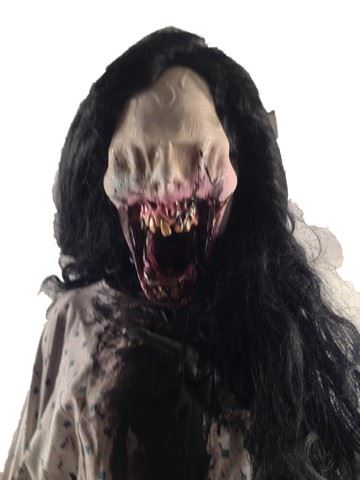 Screen used Zombie Girl prop of girl kneeling down in a hospital gown with long black hair. Her face has no eyes with a giant bloodied and gruesome mouth. When plugged in it makes sounds and shakes. (40x18)