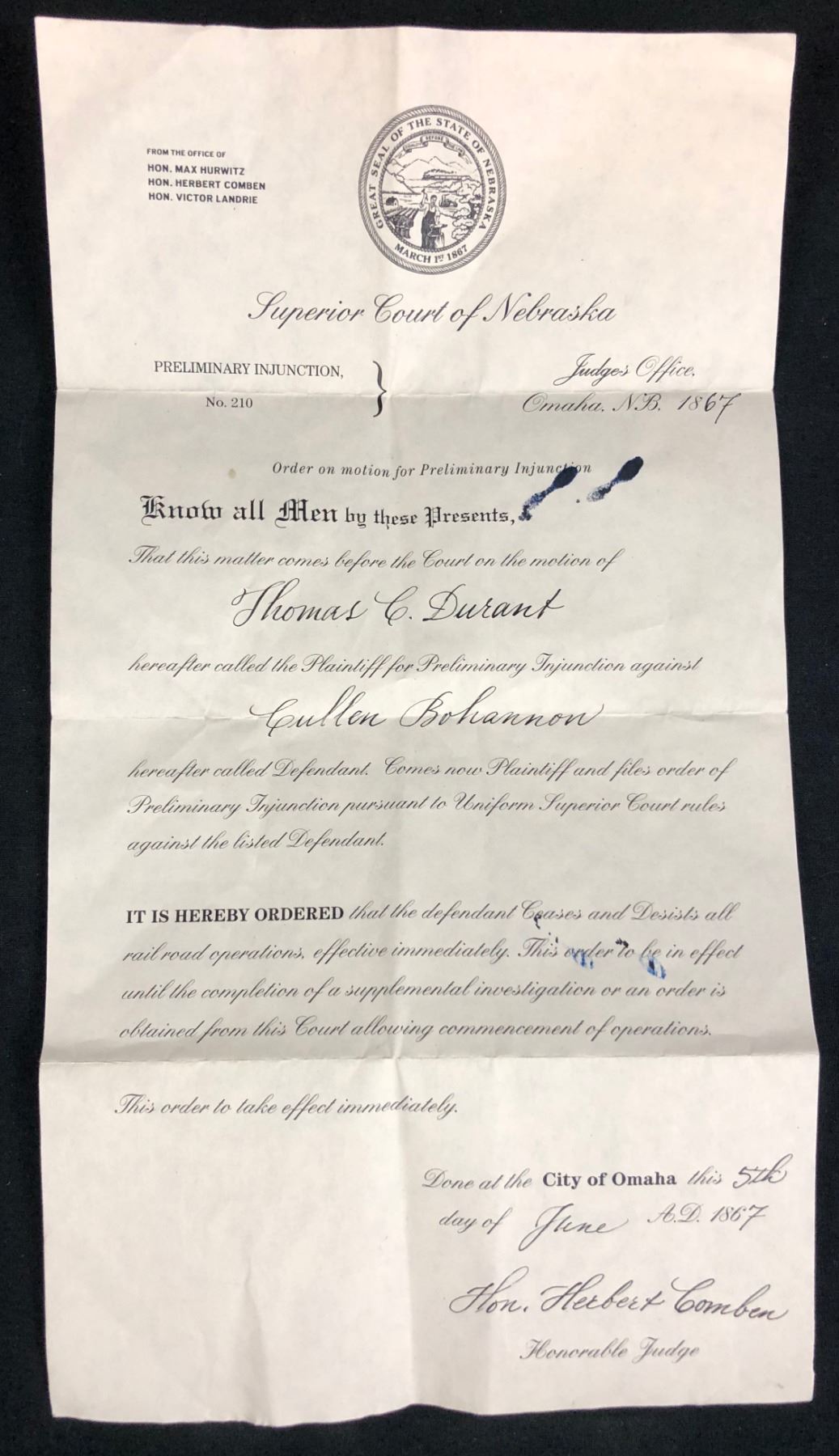 Original order on motion for preliminary injunction document to do with "Cullen Bohannon", played by Anson Mount and "Thomas 'Doc' Durant", played by Colm Meaney in the production of the Western television series "Hell on Wheels" (2011–2016) about the construction of the First Transcontinental Railroad across the United States. The series, which featured Anson Mount, Colm Meaney, Common, and Dominique McElligott, chronicled the Union Pacific Railroad and its laborers, mercenaries, prostitutes, surveyors, and others who lived, worked, and died in the mobile encampment, called "Hell on Wheels", that followed the railhead west across the Great Plains.