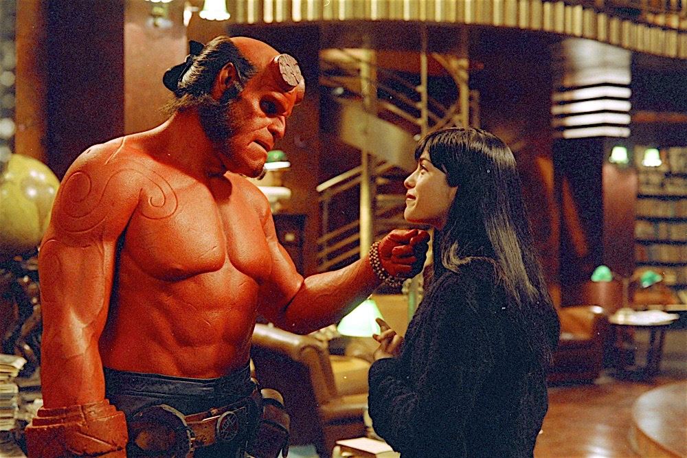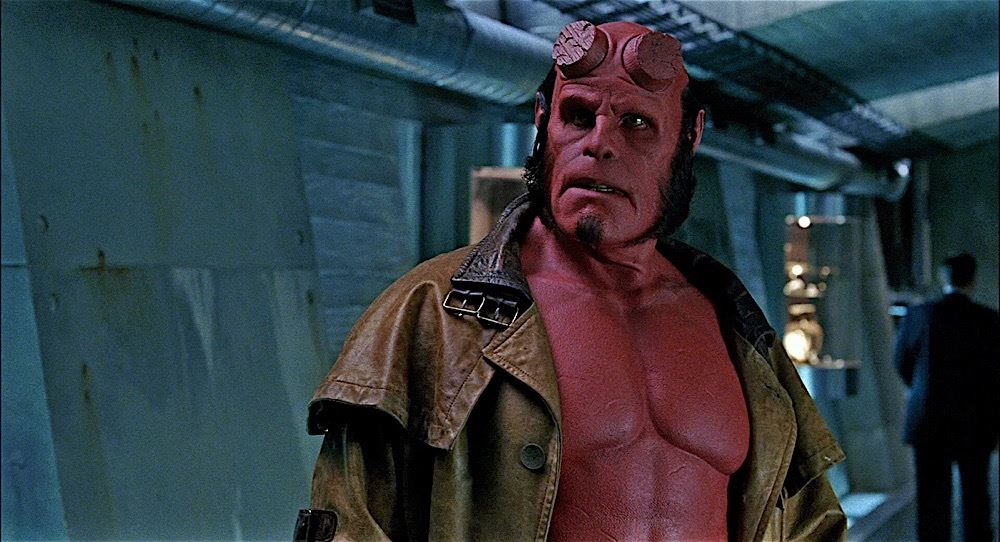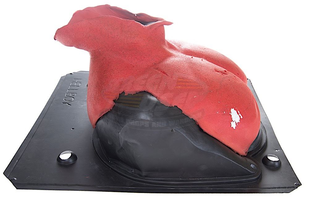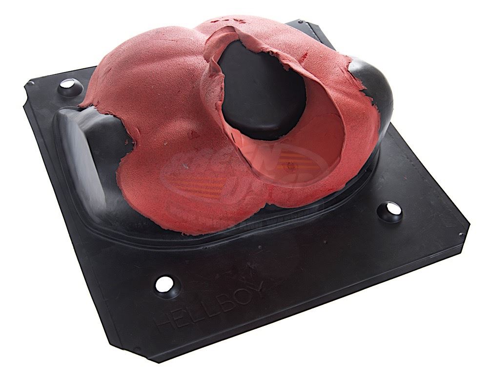 (Revolution Studios, 2004) This neck and chest appliance was custom-made by the production for use as part of the costume worn by Ron Perlman as "Hellboy". The appliance is made of foam latex and features an airbrushed finish and rests on a black plastic cast of the actor to keep the appliance's shape during production. Measures 22" x 21" x 9". Wear from use and storage is present.