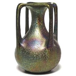 Unusual Hellosine Ware vase, four handled form with an iridescent crystalline glaze, marked, 7”h; with a Hellosine Ware vase, (not shown), organic form with a good iridescent crystalline glaze, marked, 8”h, chip to rim
