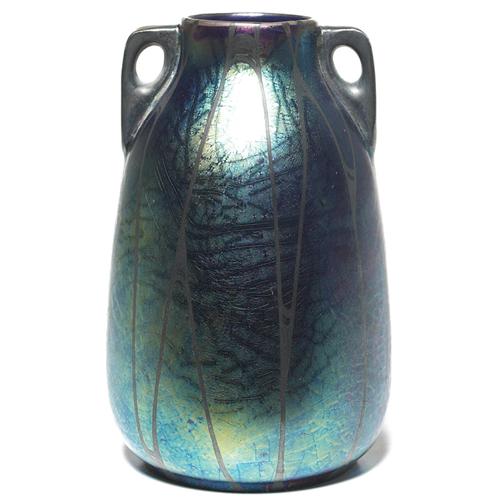 Hellosine Ware vase, attribution, handled form in a blue and green iridescent glaze and pulled designs throughout, 5"h