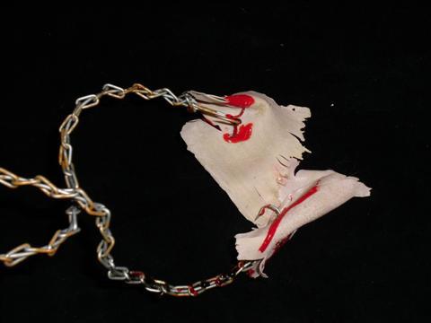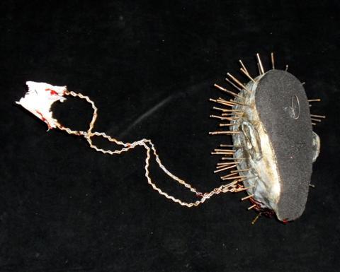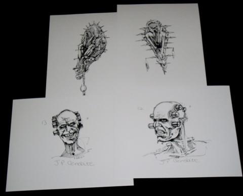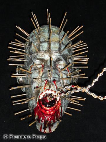 Hellraiser III: Hell on Earth (1992) - Pinhead face from column with barb wire coming out of the mouth with facial skin appliance on the end. This face was production made, but not screen used. Made of foam highly detailed and painted. Obtained from make up artist Joe Schultz. Includes four, high quality, glossy photos of concept drawings from the film. Head 13" x 8" x 8" = chain comes out 16". Oversized item. Additional shipping charges required.