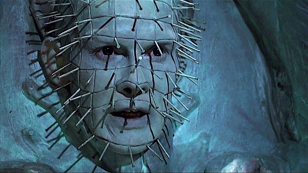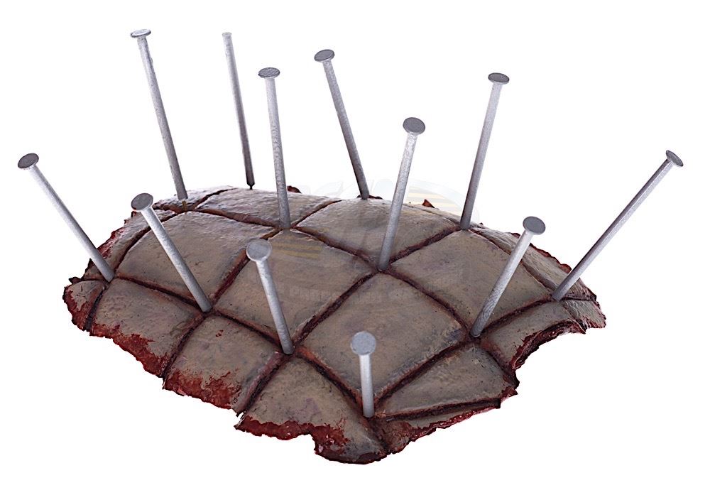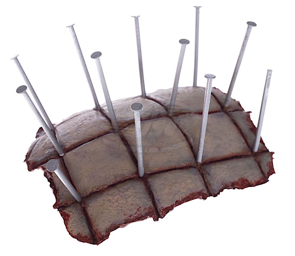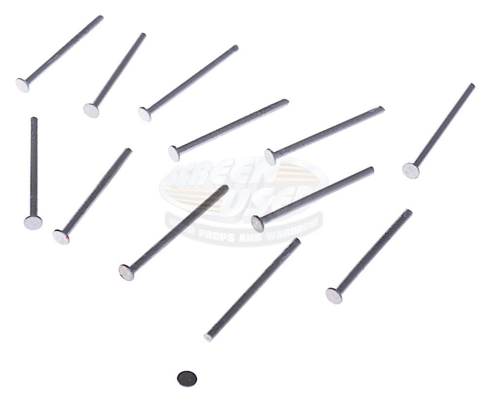 (Dimension Films, 1992) A collection of 12 prop pins that were custom-made by the production for use by Doug Bradley as "Pinhead". The prop pins are made of plastic that each measure 1.5" in length. A custom base has been created for display of the prop pins that resembles a section of Pinhead's head, making this a very unique display. Display measures 4" x 3.5".