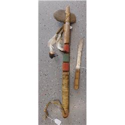 Hafted Stone Axe & Trade Knife, c. 1920-30s. Made of stone, wood, hide, paint and steel, the axe measures 29" x 6" and knife is 14&quo...