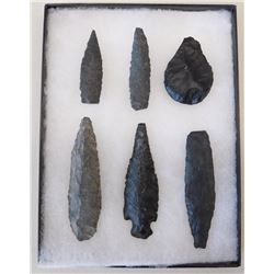 Six Spear Points, pre-historic items. Made of obsidian and chert, longest item measures 3.75" long. From San Diego County, Calif. Frame not inc...