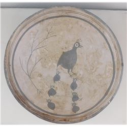 Mimbres Quail Pot, Age Unknown. Made of clay and paint, the item measures 9.25" x 9.25" x 3.5". Quail with chicks. Condition: Some s...
