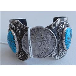Navajo Watchband w/Silver Dollar, circa 1930s. Made of sterling silver, turquoise and a Morgan silver dollar, the item measures 3" x 2" x ...
