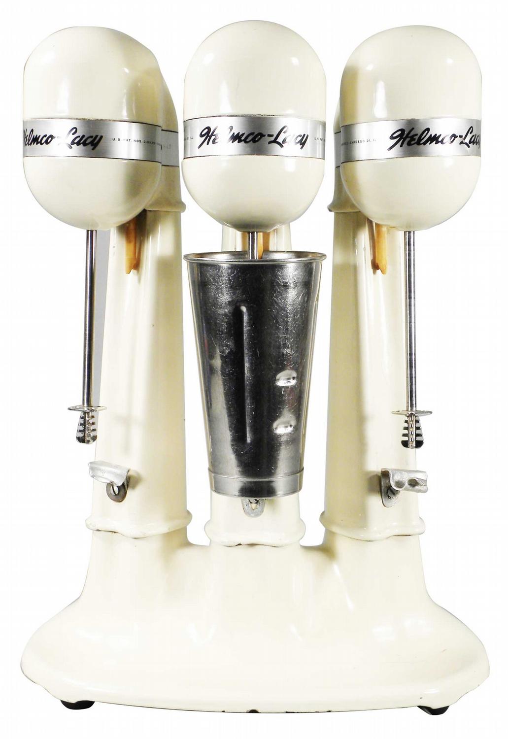 Helmco-Lacy Triple Head Malt Mixer. Ivory colored porcelain. Comes with one mixing cup. Excellent working condition. 14 1/2 X 20 X 8 inches.