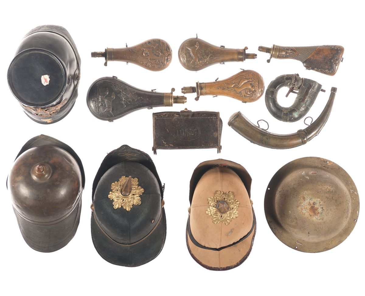 Watervliet Arsenal cartridge box, single face hunting dog motif Dixon powder flask, single face game motif Dixon powder flask, brass powder horn (repairs), single face bear hunting motif unmarked powder flask (broken spring), buttstock shaped powder flask (broken spring), Brodie style helmet (poor), single face hunting dog motif Dixon powder flask, metal powder horn, 4 other helmets. Unless noted items are good to very good.