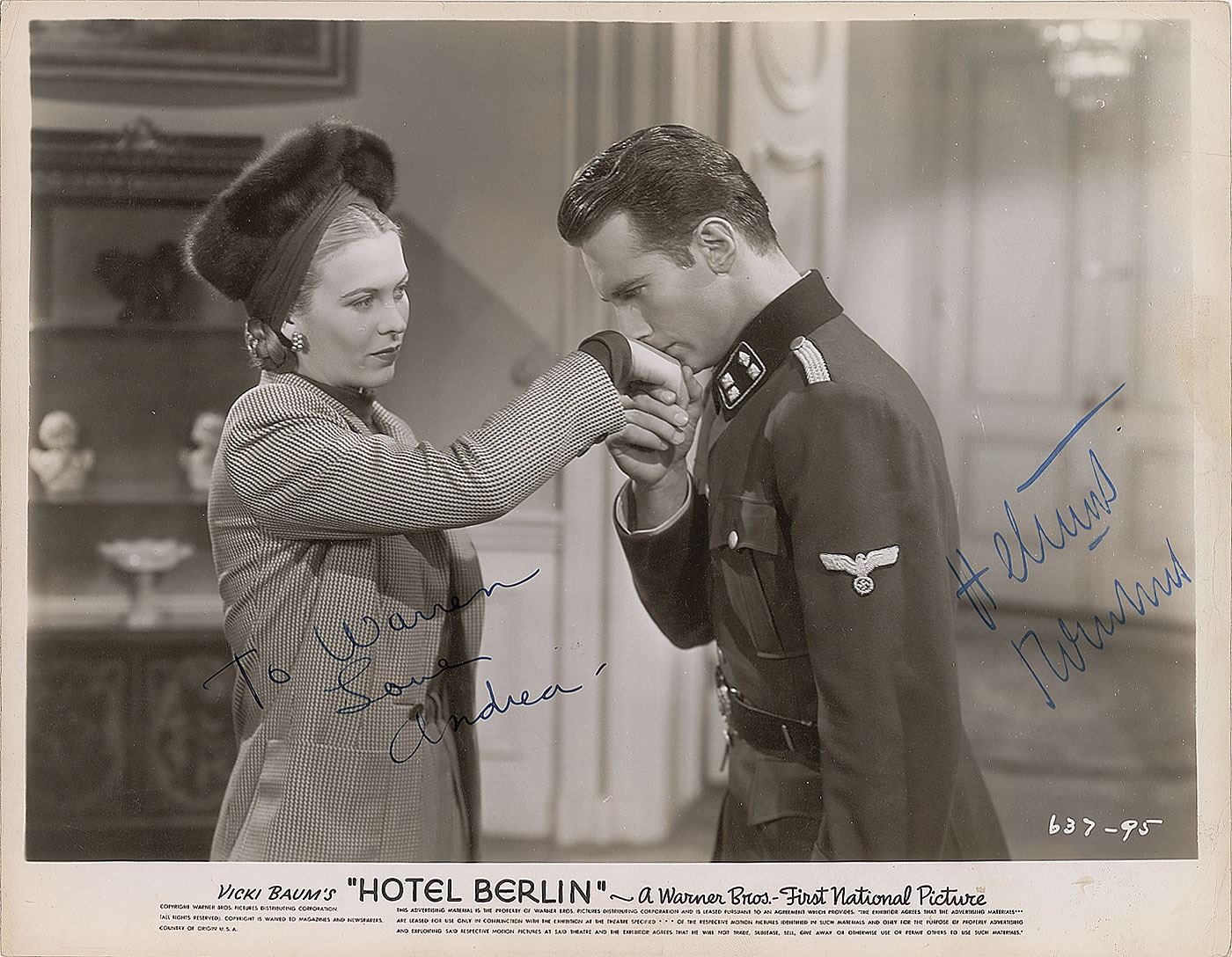 Vintage glossy 10.25 x 8 Warner Bros.–First National Picture publicity photo for the 1945 film Hotel Berlin, signed and inscribed in fountain pen, "To Warren, Love, Andrea—" and "Helmut Dantine.” In fine condition, with scattered light creasing.