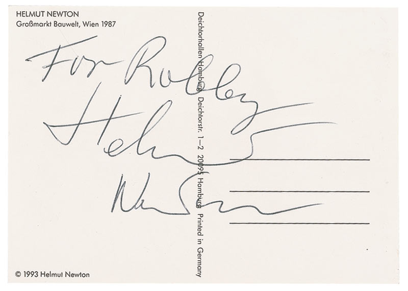 Famed German-Australian photographer (1920–2004) known for the sometimes controversial imagery of his work. Intimidating 4 x 5.75 German postcard photo of one of Newton’s photos of a leather-clad woman holding a shovel, signed and inscribed on the reverse in black ballpoint “For Robley, Helmut Newton.” In fine condition.