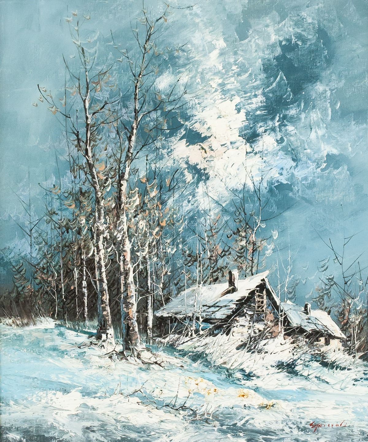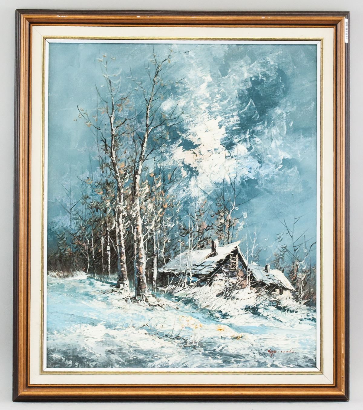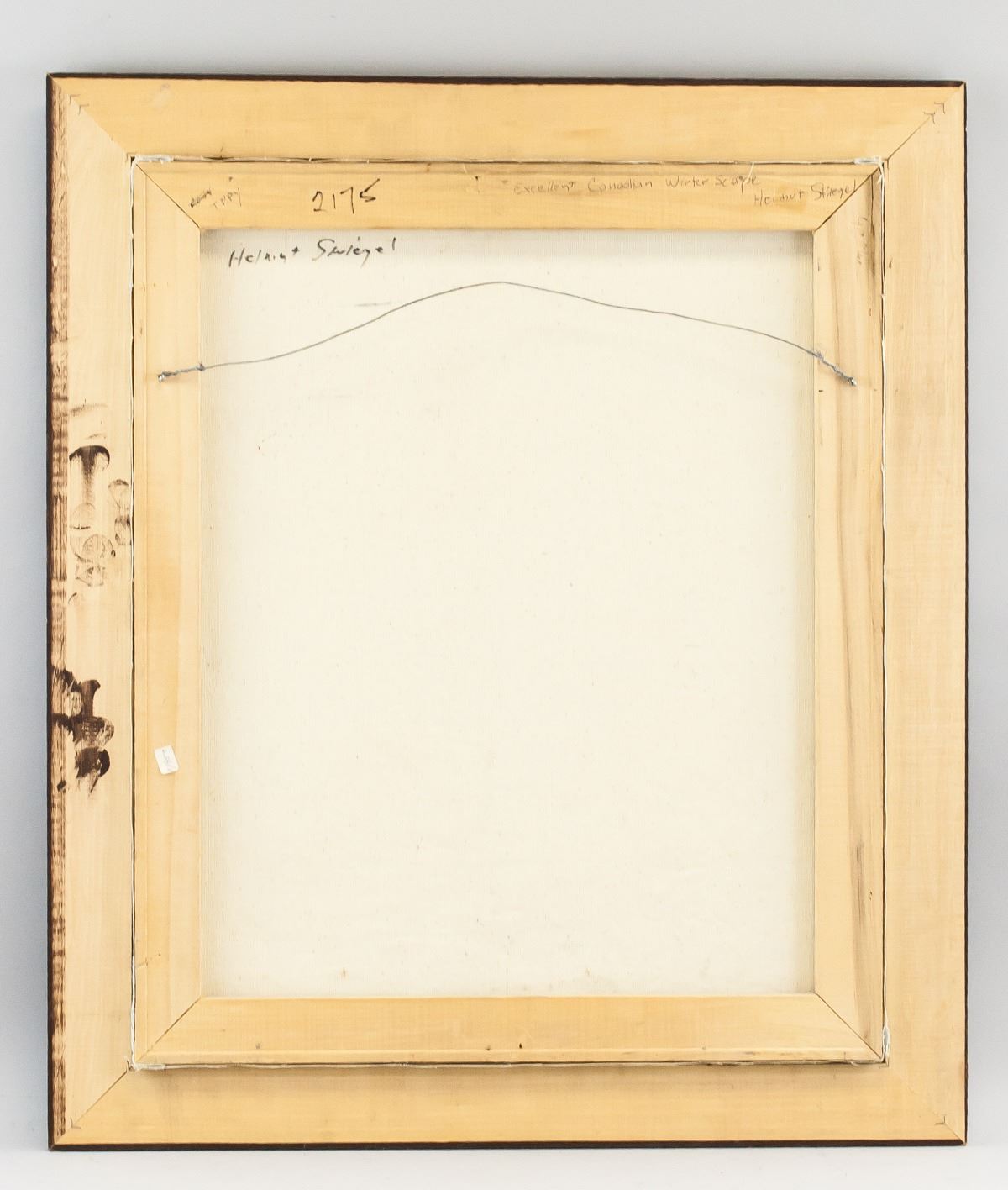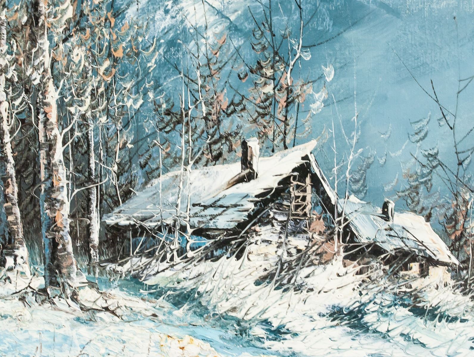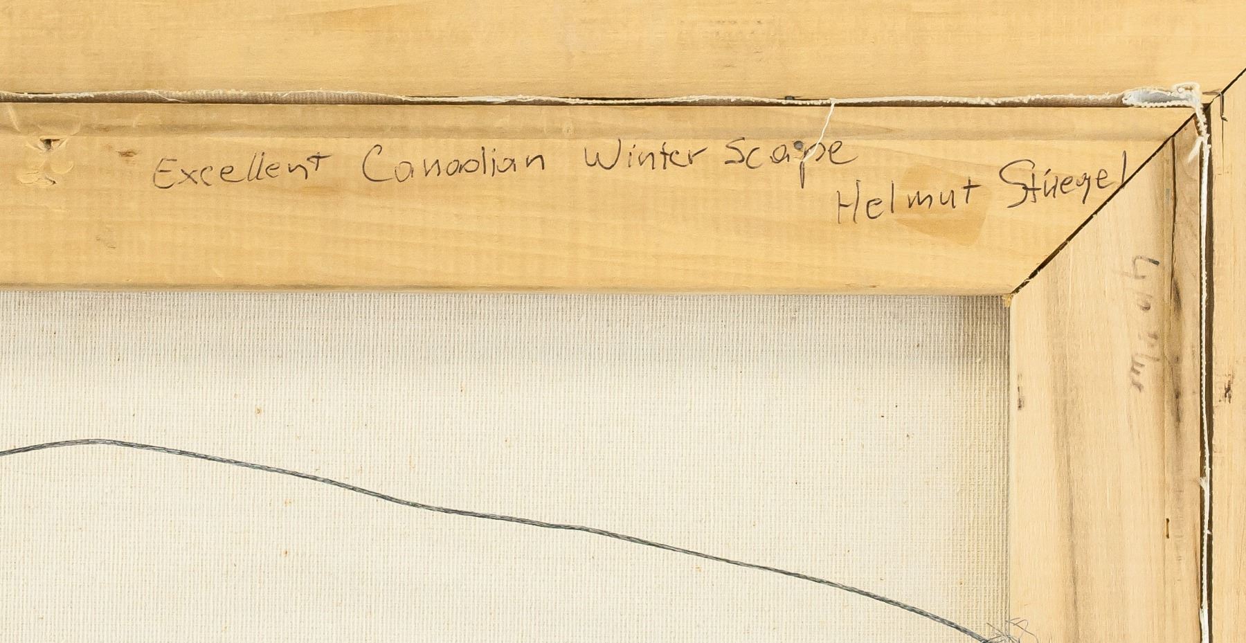 Oil on canvas, framed. Featuring snowy winter scene of a hut near the woods. Signed "Striegel" in the bottom right corner. "TPPY 2175 Helmut Striegel" inscribed on verso. "Excellent Canadian Winterscape Helmut Stiegel" inscribed on verso. 60 x 50 cm (23.5 x 19.75 inches), Frame Size: 74 x 62 cm (29 x 24.5 inches)
