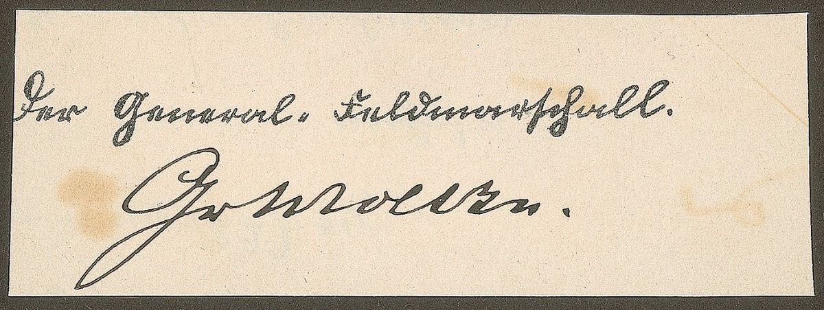 German military officer (1800–1891) who was chief of staff of the Prussian army for 30 years and who is regarded as one of the foremost military strategists of the 19th century. Ink signature, “G. v. Moltke,” on an off-white 3.75 x 1.25 slip affixed to a larger mount. In fine condition, with a couple of small stains.