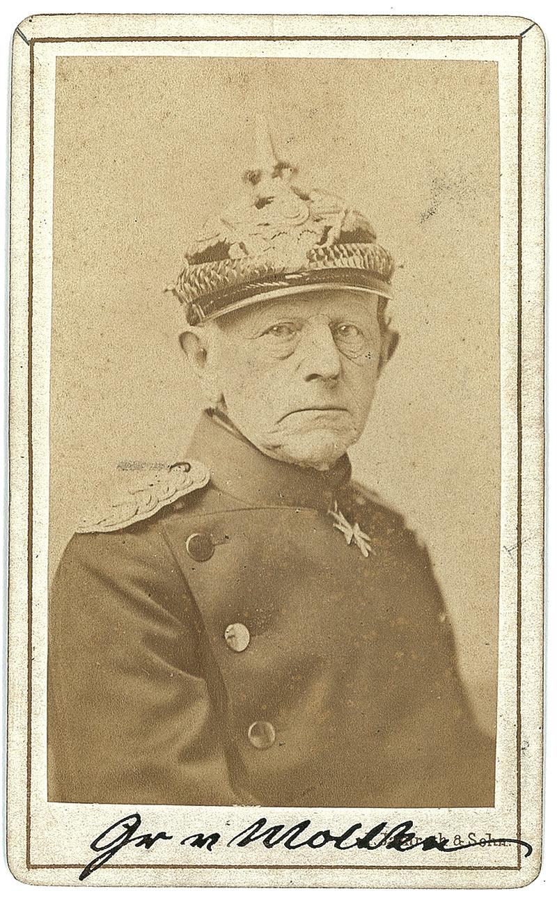 German military officer (1800–1891) who was chief of staff of the Prussian army for 30 years and who is regarded as one of the foremost military strategists of the 19th century. Original vintage 2.5 x 4 carte-de-visite photo of von Moltke in uniform, by F. Jarmath and Son of Berlin (and so stamped on the reverse), signed in black ink. Written on the reverse, in the hand of the photo’s original recipient is “I sent this Carte to Gen. von Moltke at Versailles by Post, on Nov. 5, 1870, and received it back (signed) Nov. 15, 1870.” In fine condition, with some scattered light spotting to image. Provenance: The Barry Hoffman Collection.