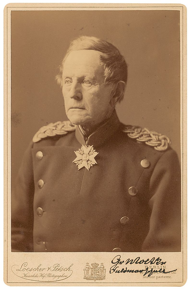 German Field Marshal (1800–1891) regarded as one of the great military strategists of the latter 19th century. Original 4 x 6.5 cabinet photo by Loescher and Petsch of Berlin, signed in the lower border in black ink, adding his rank under his signature. In fine condition.