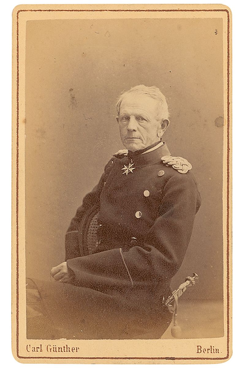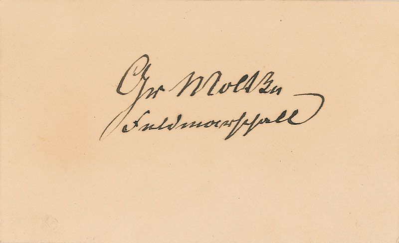 One of Moltke’s personal visiting cards, 3.75 x 2.25, signed on the reverse in black ink, “Gr Moltke, Feldmarschall.” Adhesive and mounting remnants on the front, otherwise fine condition. Accompanied by an unsigned carte-de-visite of Moltke in uniform.