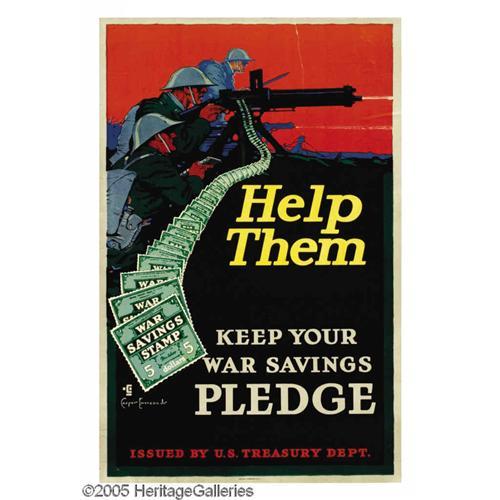 <B>Help Them</B></I> (Lot of 3) 30" x 20" Artist: Casper Emerson Jr. Issued by the United States Treasury to promote the Victory Liberty Loan. In order to pay for the war effort the United States Government issued a set of five liberty loans. The fifth and final loan was known as the Victory Liberty Loan. Working persons would buy these bonds or war stamps that they could then trade in for smaller denominations of bonds, which at the end of the war would be repaid with interest. A great poster, very evocative. <BR><BR>Condition: <BR>Poster 1-Superior; slight cracking of the ink on bottom edge. <BR>Poster 2-Superior; small tear on one edge, otherwise perfect! <BR>Poster 3-Good; several major/severe tears on upper and lower edges some of which extend into the graphic. <BR><BR><B>Important notice:<