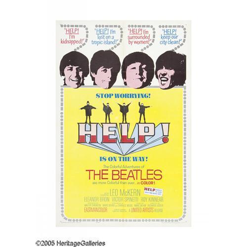 <B>Help (United Artists, 1965).</B></I> One Sheet (27" X 41"). In their second collaboration with director Richard Lester, the Beatles again mix wacky comedy with perfectly crafted pop music. The light plot involves a sacred ruby ring that comes into Ringo's possession, attracting the unwelcome attention of an exotic religious cult and forcing the boys to go on the run. The narrative only serves as a pretext for exotic excursions from Europe to the Bahamas and for elaborate musical numbers, with such classic songs as "Ticket to Ride," "You've Got to Hide Your Love Away," and, of course, "Help!" The bright colors, including a retina-searing yellow, bursts off the page, and the edges and corners remain sharp. A bit of wrinkling around the fold lines appear, and the crossfolds have only just begun to separate. Very Fine/Near Mint.