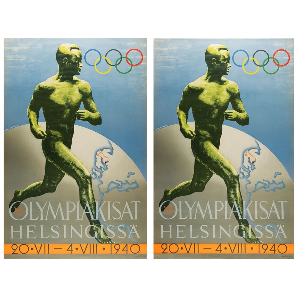 Matching pair of attractive original color 25 x 38.5 posters for the Helsinki 1940 Summer Olympics designed by Ilmari Sysimetsa, which depict a large statue of an athlete above an image of the Earth, with Finland outlined in orange and Helsinki marked with a black dot. The Olympic rings are present in the upper section, and the lower features bold text: “XII. Olympiska Spelen, Helsingfors, 20.VII–4.VII. 1940.†Both are rolled and in overall fine condition, with minor edgewear.