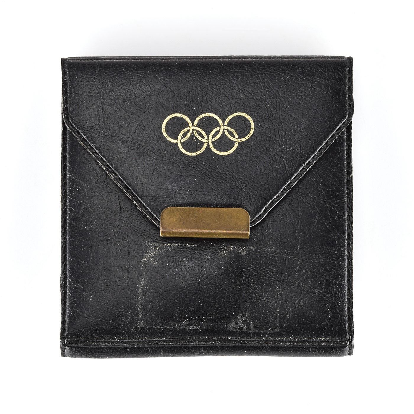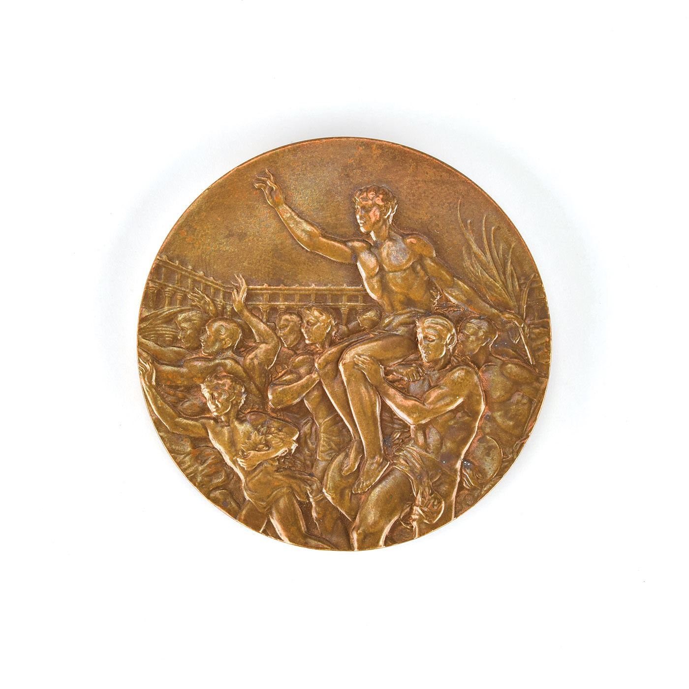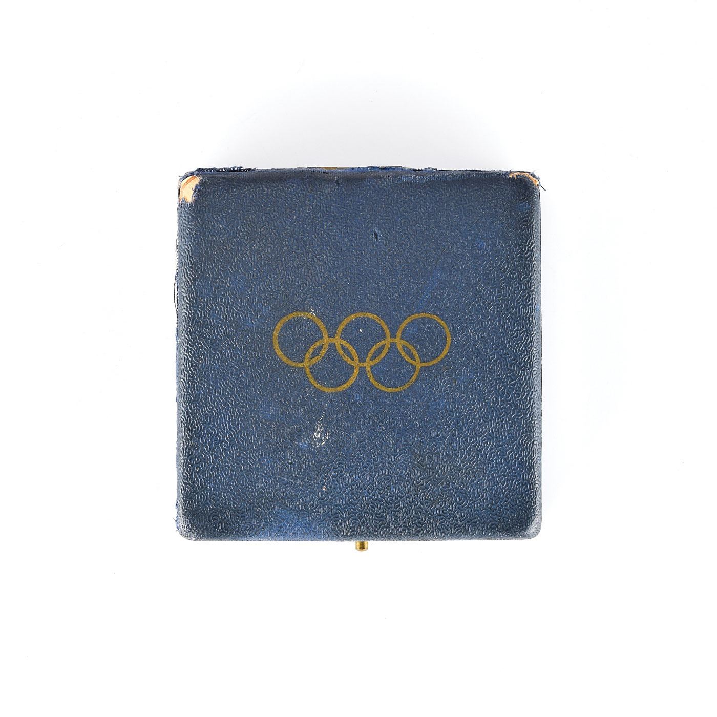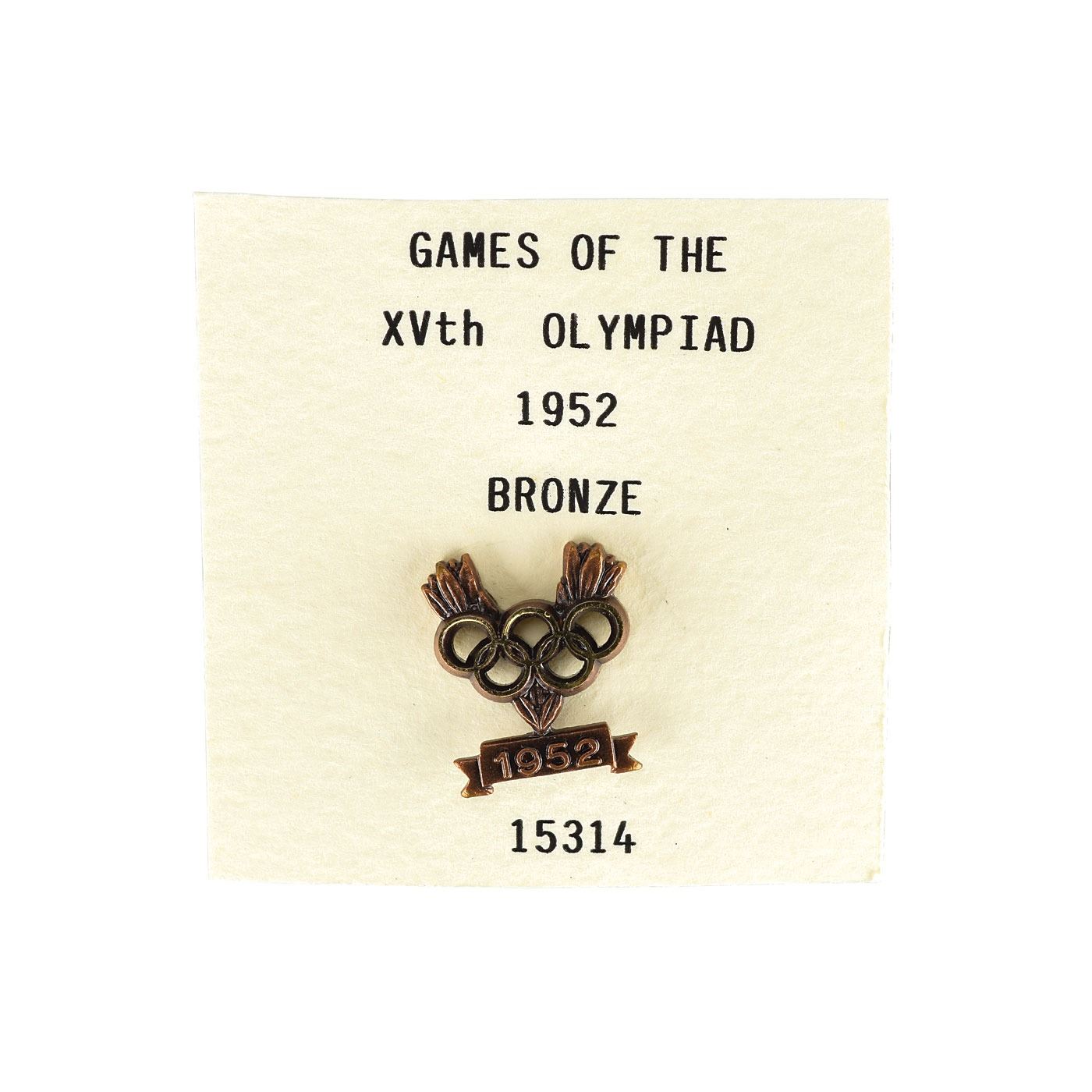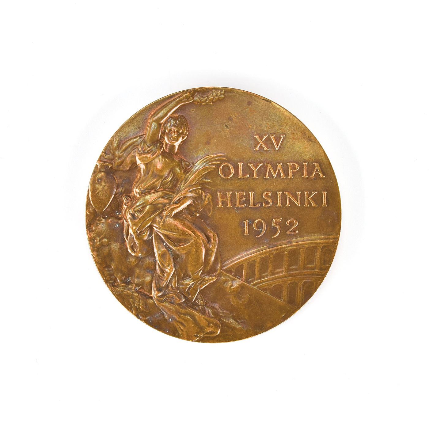 Appealing winner's medal issued for the Helsinki 1952 Summer Olympics. Bronze, 51 mm, 59 gm, by Giuseppe Cassioli. The front, inscribed, "XV Olympia, Helsinki, 1952," features a 'Seated Victory' with the Coliseum in the background; the reverse portrays a winner carried by jubilant athletes. Includes its original dark blue presentation case and scarce bronze winner’s medal pin, marked on the reverse, “15314,” with black vinyl presentation pouch made by Bertoni of Milan. Only 320 of these bronze medals were issued at the Helsinki games, making this is an uncommon and sought-after example.