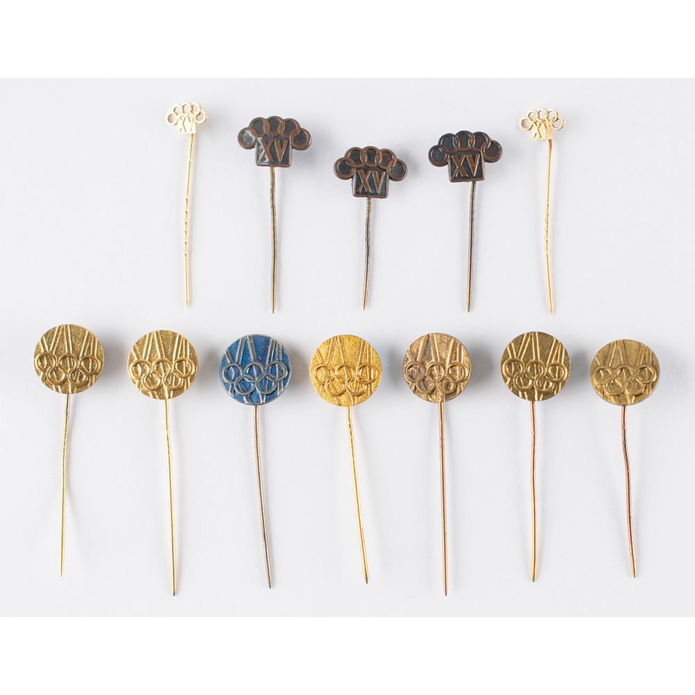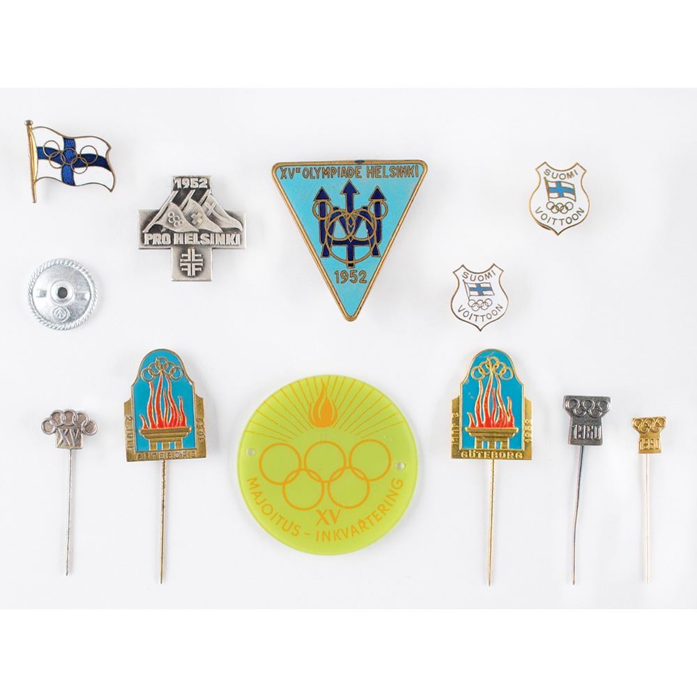 Collection of 24 Finnish-made pins and stick pins, the majority issued for the Helsinki 1952 Summer Olympics, ranging in size from 6 mm x 6 mm to 51 mm in diameter, which includes some fundraising variants. In overall fine condition.