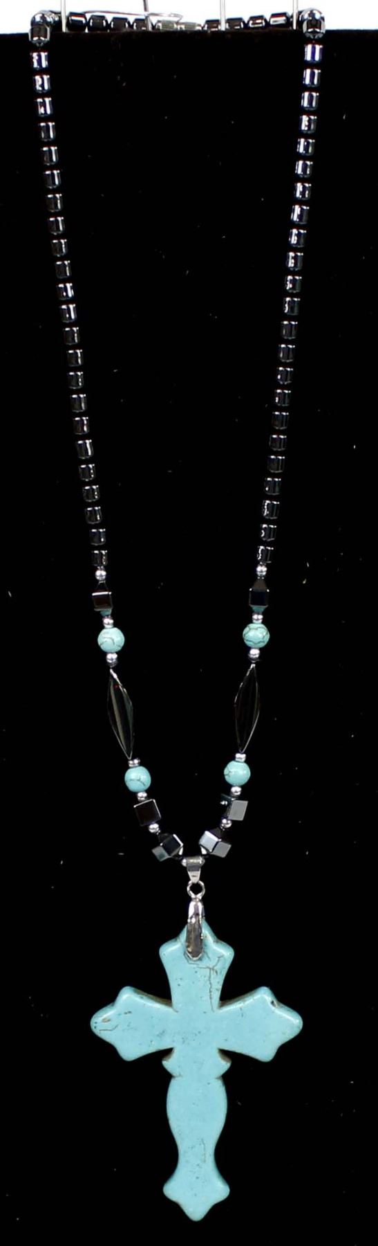 Hematite Bead Necklace with Dyed Howlite Cross Pendant, necklace measures 16"L end to end, cross pendant measures 2" x 3"