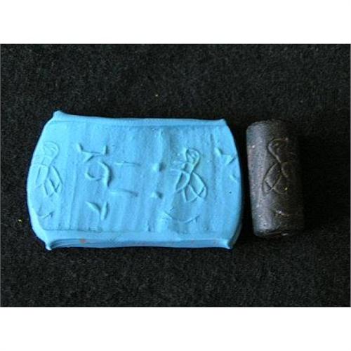 On sale is an exquisite "Hematite Cylinder Seal with Glyphs" circa 2,200B.C. to 2,000B.C. This rare seal is from our private collection and its original provenance is from Syria. Featured is black hematite stone carved cylinder with a bored hole and engravings. The rolled out seal reveals the impression of a bee or bird and a line of glyphs. This unique cylinder seal is in superb condition and wearable.
