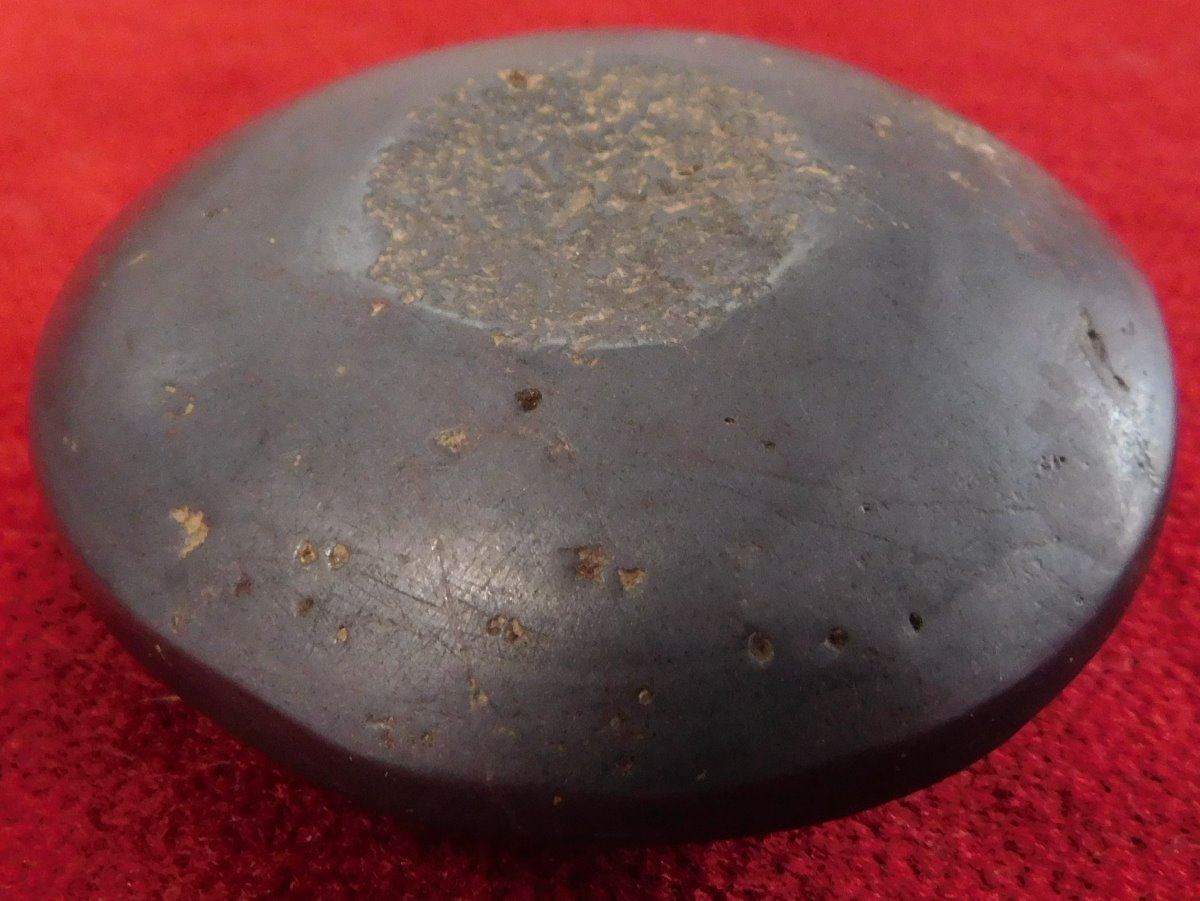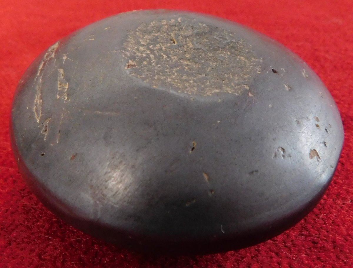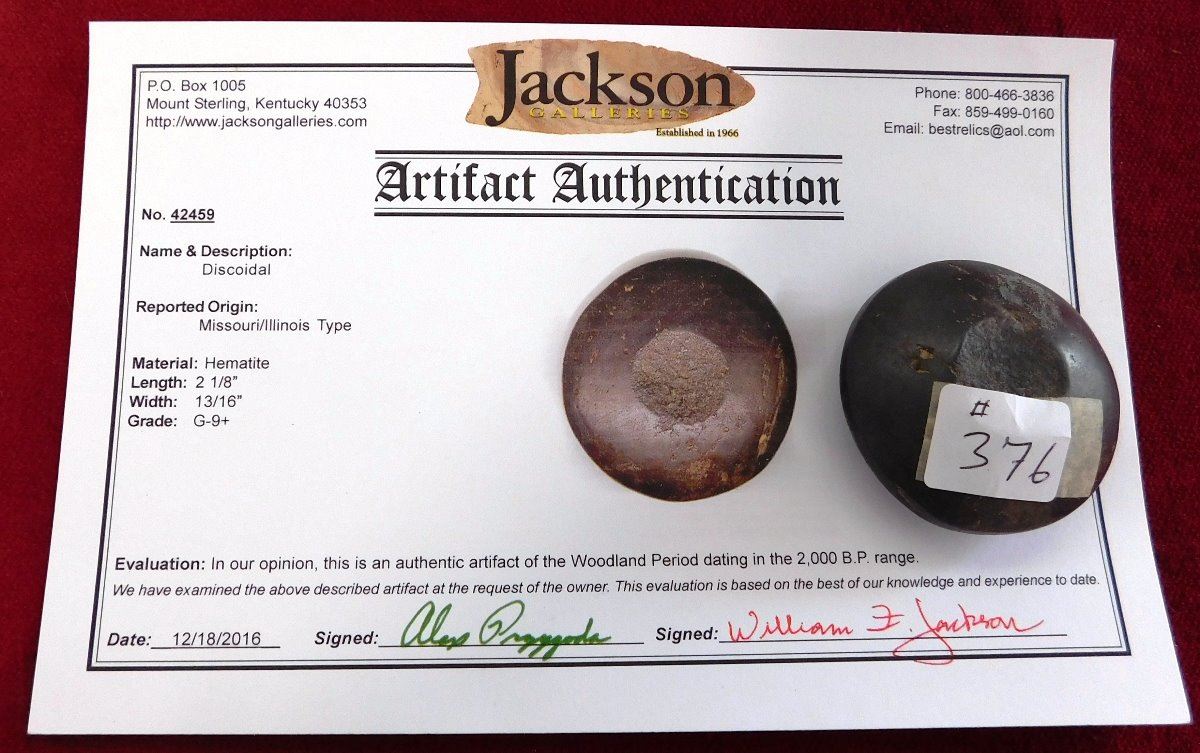 Hematite Discoidal w/Jackson COA, c. 2000 yrs B.P. Made of hematite, the item is 2 1/8" x 13/16". Missouri, Illinois-type discoidal. Rare, polished hematite discoidal of investment quality. Condition: Grade 9, see images. Shipping: $16.50 w/insurance and signature.