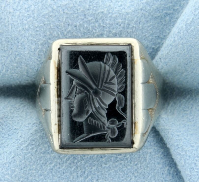 In 14K white gold, there is an inscription on inside of shank-"Corinne To Carl 2-22-32". The stone is 17x12mm. And the ring is a size 11. 11.9g