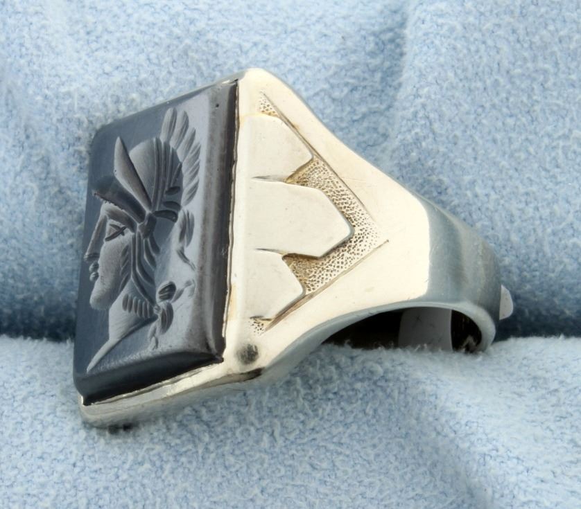 In 14K white gold, there is an inscription on inside of shank-"Corinne To Carl 2-22-32". The stone is 17x12mm. And the ring is a size 11. 11.9g
