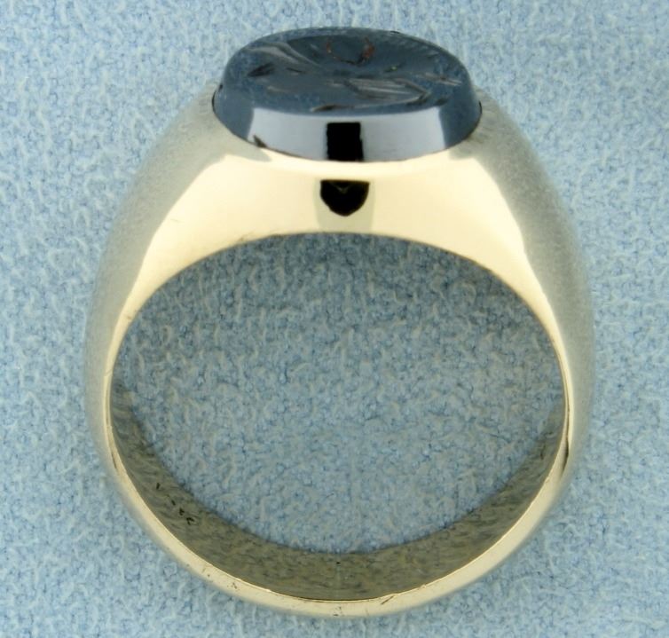 In 10K yellow gold, this ring contains a 16x12mm oval hematite gemstone. Size 10 10.6g