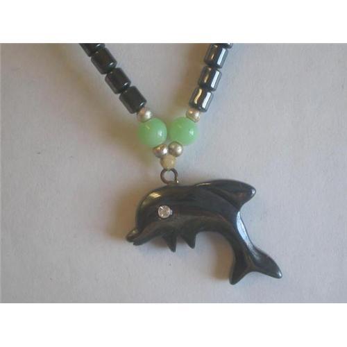 So cute ! A dolphin of black onyx hematite with a crystal rhinestone eye suspended from Bali silver beads and accented by two round Jadeite beads with small barrel shaped hematite beads all around the main part of the necklace. There is an old style roller barrel screw closure. The necklace measures 17" inches in total length - the measurements of the dolphin are 1-1/8" inches wide by 1" inch in length. The back of the dolphin is a flat surface so it rests comfortably and lays nice and flat on the neckline. The jadeite beads are 4m and the hematite beads are 5m. Very unique and charming. Other hematite pieces are currently listed.
