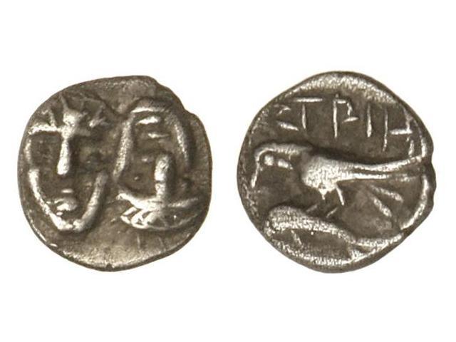 Hemióbolo. 400-350 a.C. ISTROS. Anv.: Dos cabezas masculinas una derecha y otra invertida. Rev.: Águila sobre delfín. 0,50 grs. AR. Se-No cat. MBC+.
