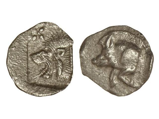 Hemióbolo. 500-490 a.C. KYZIKOS. Anv.: Cabeza de león a izquierda, encima estrella. Rev.: Medio jabalí a izquierda. 0,40 grs. AR. Se-No cat.; SNG.Tubingen-2217. MBC+.