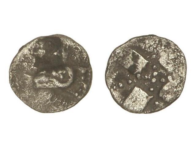 Hemióbolo. - EMPORITON. - FRACCIONES ANTERIORES A LOS DRACMAS. - Anv.: Cabeza de carnero a izquierda. Rev.: Cruz de puntos en zona incusa. 0,20 grs. AR. (Pequeña oxidación en anverso). Vill-2 var. MBC. - -