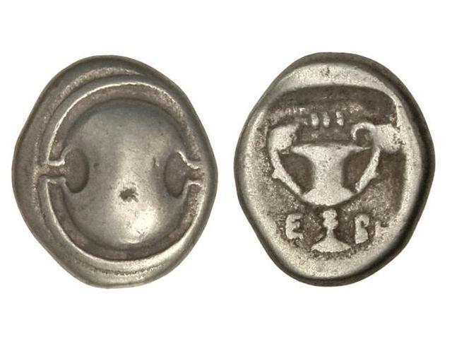 Hemidracma. - 379-371 a.C. - BEOCIA. - Anv.: Escudo Beocio. Rev.: Cántaro dentro de cuadro incuso. 2,60 grs. AR. (Golpe en anverso). Se-2385. MBC+/MBC. - -