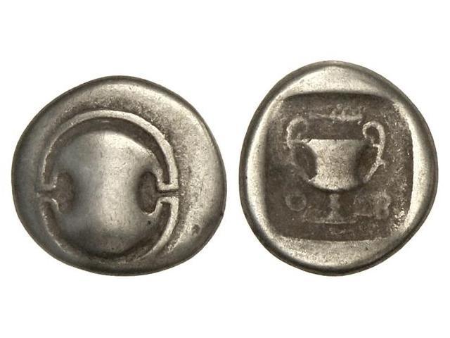 Hemidracma. - 379-371 a.C. - BEOCIA. - Anv.: Escudo beocio. Rev.: Cántaro dentro de cuadro incuso. 2,60 grs. AR. Se-2385. (MBC+). - -