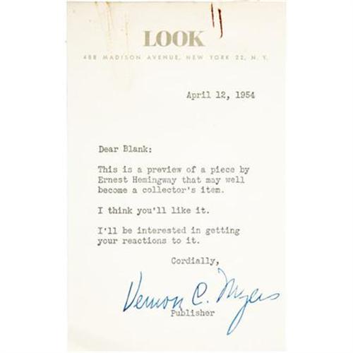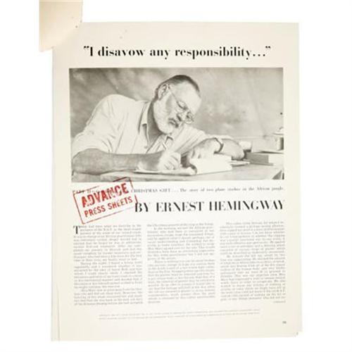 <B>Ernest Hemingway, “I disavow any responsibility…”, Advance Press Sheets for Part II of Story Written for </B></I><B><I>Look</B></I></B></I><B> Magazine, April 1954</B></I>. Eight pages with two-page editor’s note, 10.5” x 13.25”, accompanied by note on <I>Look</B></I> letterhead, 3.75” x 6”, from publisher Vernon C. Myers, April 12, 1954, in gray folder with black lettering and red “Advance Press Sheets” stamp. Ernest Hemingway (1899-1961) wrote this special story for <I>Look</B></I> magazine after barely surviving two serious plane crashes while on safari in Africa in 1953. In fact, Hemingway was injured so gravely both times that many newspapers published his obituary after each crash. The author’s descriptions of his dreams while suffering through a concussion include a meeting with Senator Joseph McCarthy, an unconscious event which Hemingway blames on the damaged condition of his brain. He writes in part: <I>“I wished that Sen. Joseph McCarthy of Wisconsin had been with us at the crash of both aircraft. …I wondered if without his senatorial immunity he would be vulnerable to various beasts with whom we had been keeping company. This thought held my disordered mind…I must confess with a certain degree of enjoyment. Then…I wondered if anything was wrong with Sen. Joseph McCarthy of Wisconsin which a .577 solid would not cure.”</B></I> A fine example of Hemingway’s writing in his later years, the article is a bold document of the times in which it was written. The press sheets are in very fine condition; the <I>Look</B></I> note is very good with a paper-clip mark and one fold; the folder is near fine with a paper-clip mark and some minor creases at the edges.<BR><BR><b>Shipping:</b> Flat Material, Small (<a target="_blank" href="http://www.heritageauctions.com/common/shipping.php">view shipping information</a>)