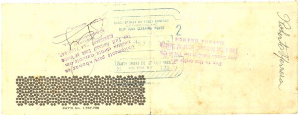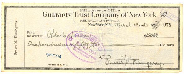 Bank check filled out and signed in ink "Ernest M. Hemingway", payable to Roberto Herrera for $150.00 dated March 17 1953, endorsed "Roberto Herrera", 3 1/4 x 8 1/2 inches. (minor foxing, with expected bank stamps and cancellation holes),