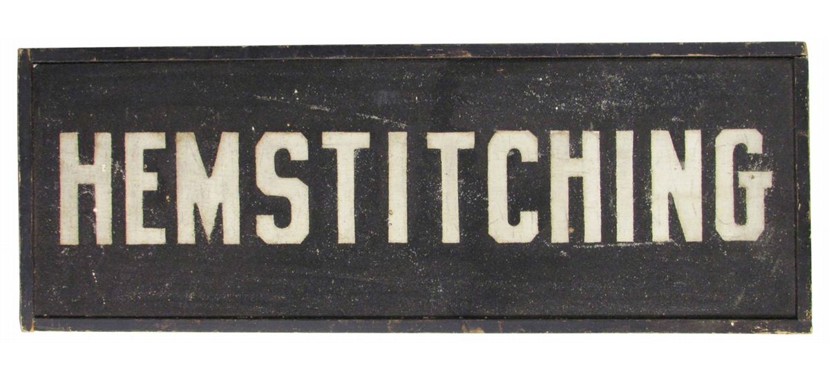 "Hemstitching" Outdoor Wood Sand Sign. Circa early 1900's. Very good original condition. 21 3/4 X 7 3/4 inches.