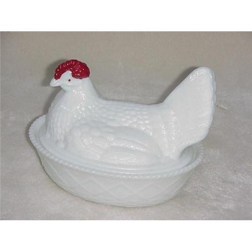 A Westmoreland Glass Co. animal dish with cover. A hen sitting on a basket weave bottom, 8" long, 6" tall. Marked with the WG monogram. Condition is very good, no chips or cracks. (3)