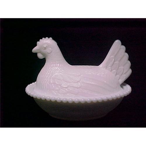 Here?s a cute Hen on Nest covered dish in classic milk glass. The dish is oval with a beaded rim and textured sides, and measures 7 inches by 5 ½ inches, 2 inches deep. The entire piece is approximately 5 inches tall.