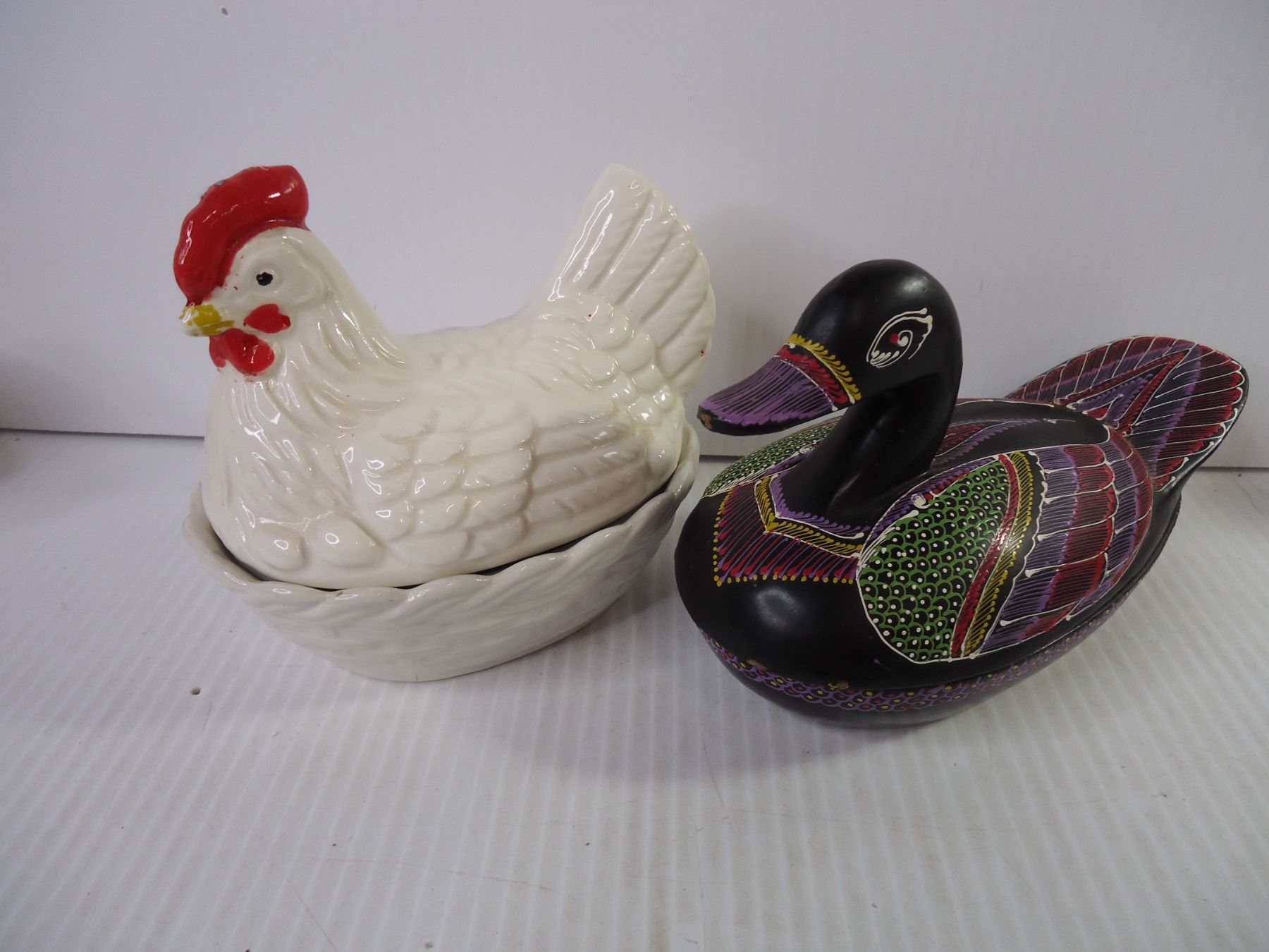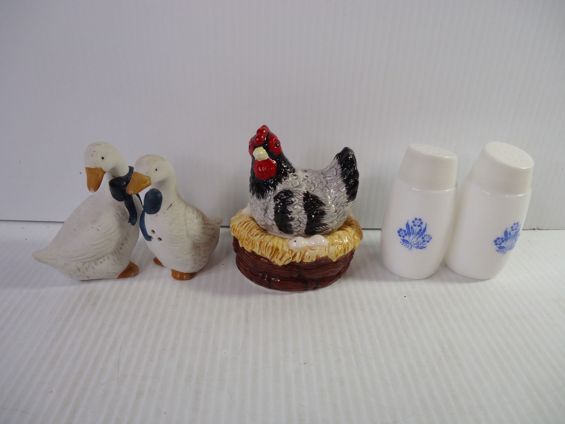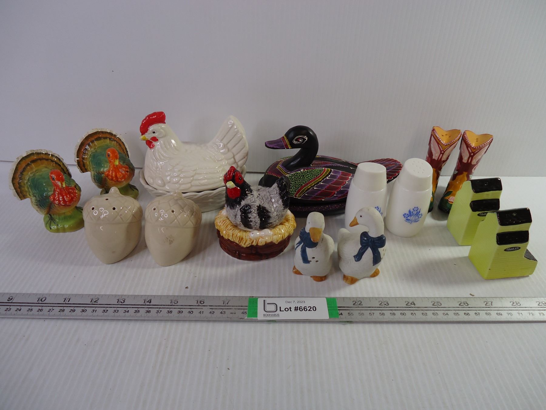 Hen on Nest, Wooden Duck on Nest, and (7) Sets of Salt/Peppers