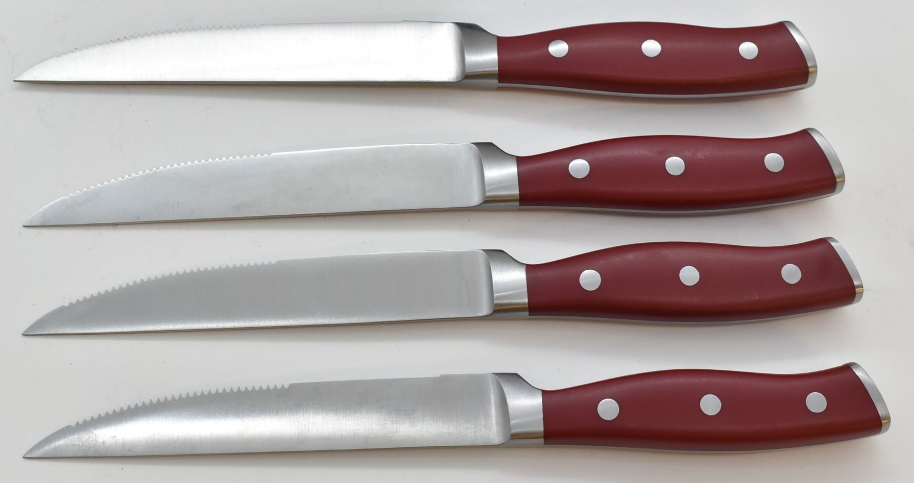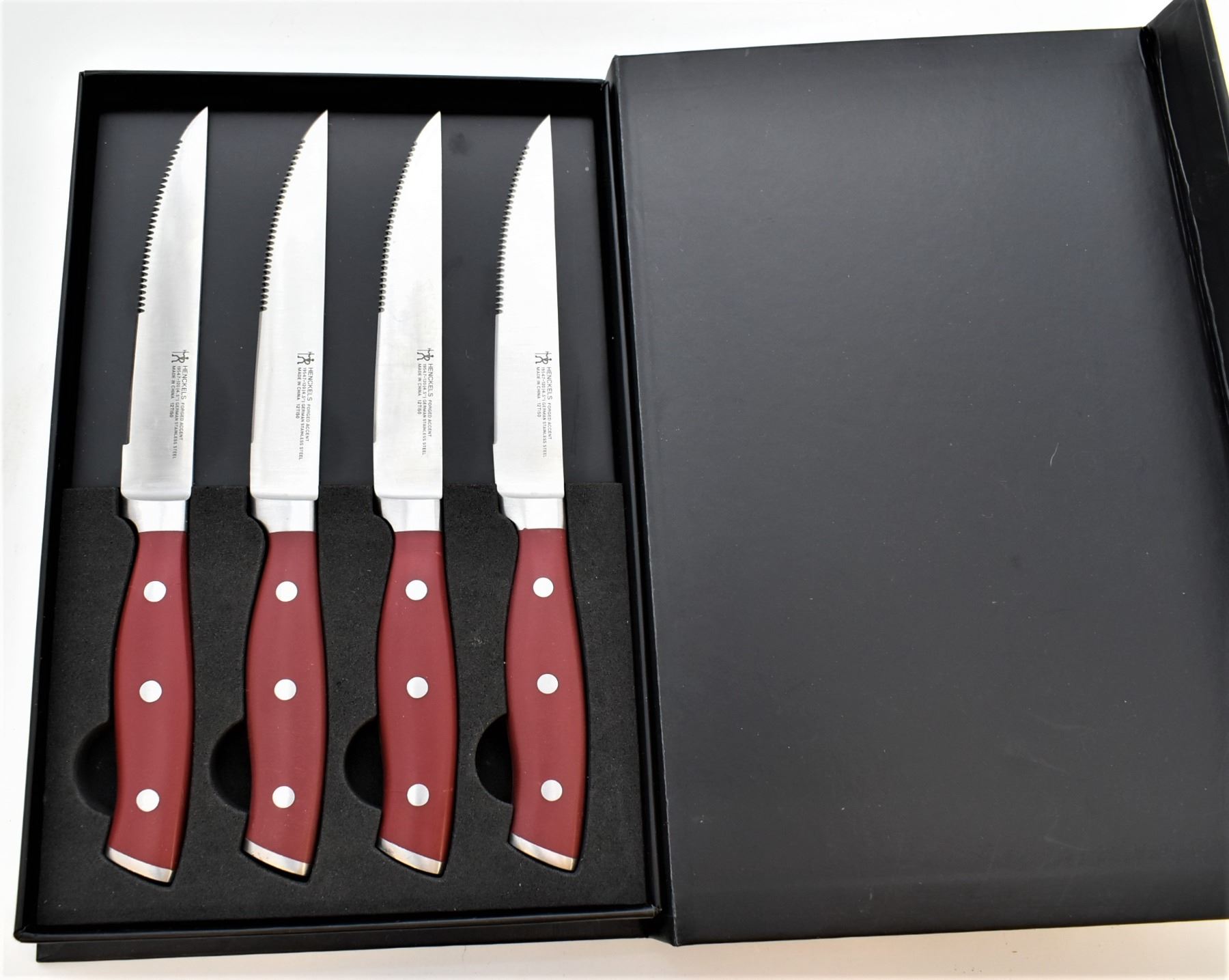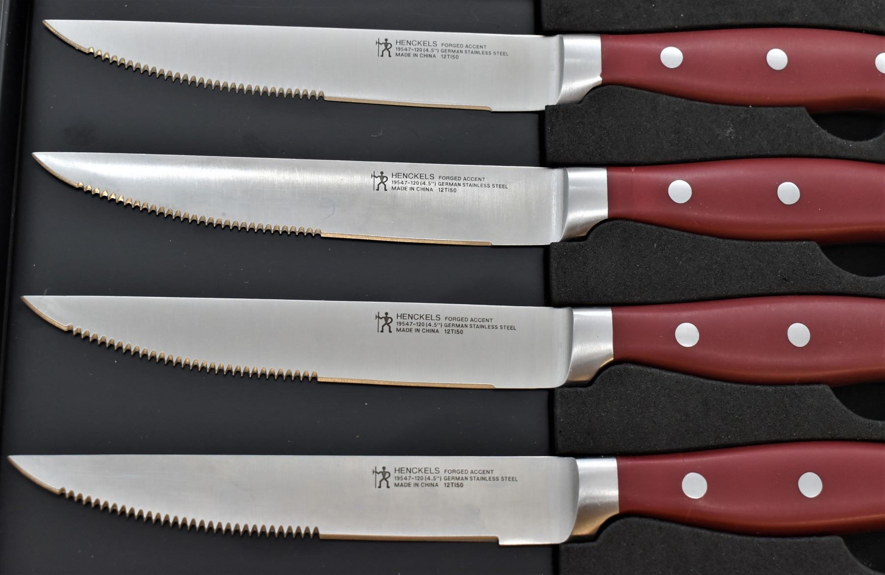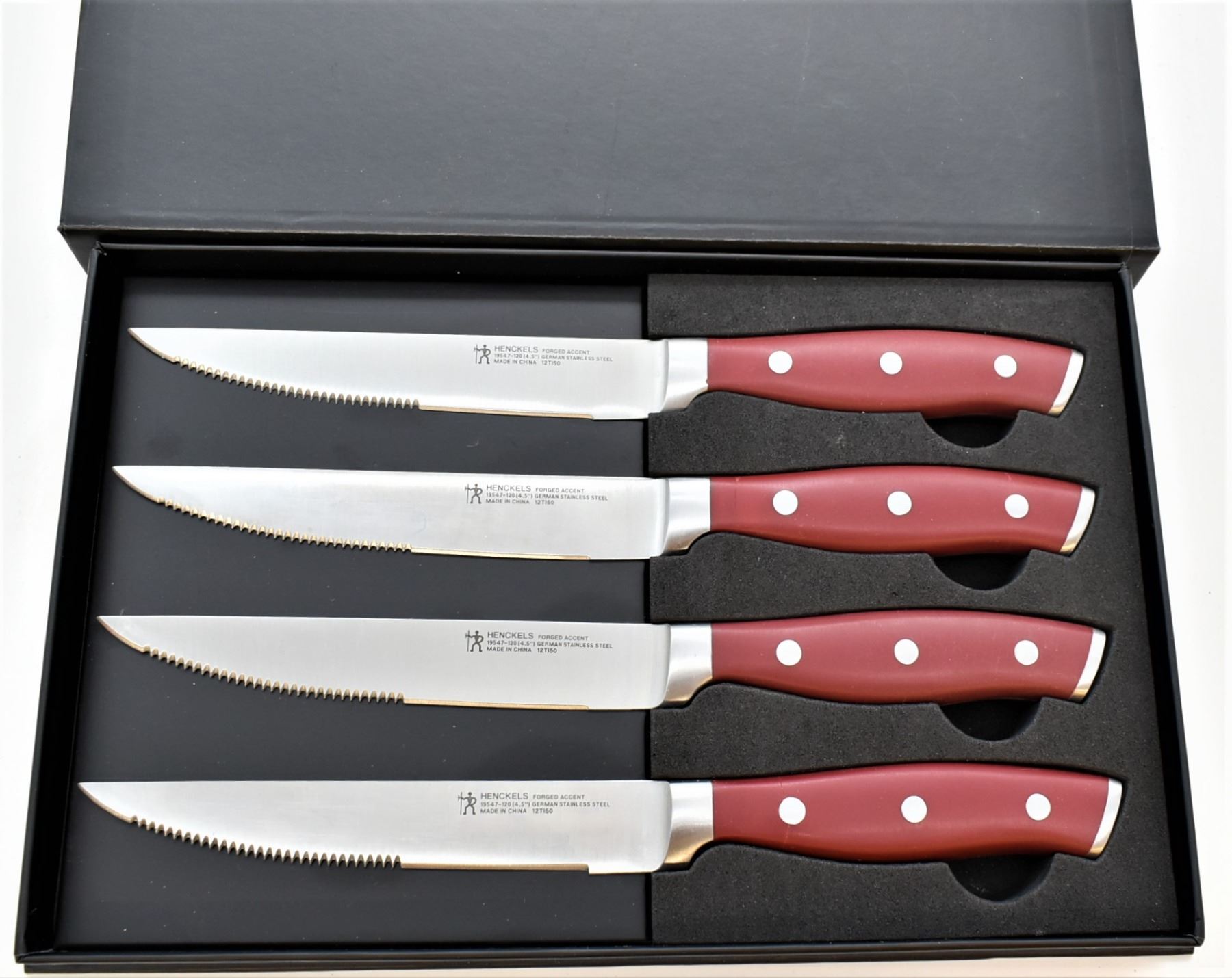 Set of 4 Henckels Forged Accent German Stainless Steel Steak Knives, like new, come in original box, all have protector tips, blades are marked, measure 9 3/8''L x 1''W, razor sharp serrated edges