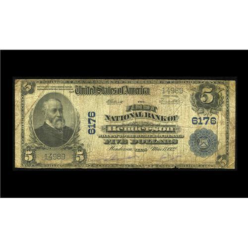 <B>Henderson, TX</B></I> - $5 1902 Plain Back Fr. 608 <B>The First NB </B></I> Ch. # 6176<BR>A <B>Very Good</B></I> example from the run with 1922 dated plates. While a well circulated <B>Very Good,</B></I> it comes from an institution with a Kelly population of only four in large size.