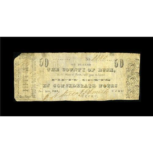 <B>Henderson, TX- Rusk County</B></I> 50¢ Jan. 11, 1864 Medlar UNL<BR>The Medlar reference lists only a 25¢ note with this date from Rusk County. <B>Very Good,</B></I> with a corner tip off.<BR><I>From The William A. "Bill" Bond Collection</B></I><BR><BR><b>Shipping:</b> Coin/Currency (<a target="_blank" href="http://www.heritageauctions.com/common/shipping.php">view shipping information</a>)