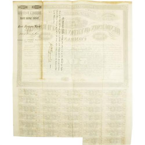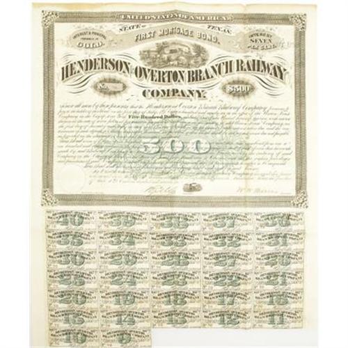 <B>Henderson and Overton Branch Railway Company 7% Gold Bond 1876.</B></I><BR> This company laid 16 miles of track in Rusk County, Texas. In 1880 it was gobbled up by larger railroad concerns. This bond was printed by R. Studley Company of St. Louis. It has a nice train vignette that is a copy of the ABNCo vignette "The Crossing." Thirty-two coupons remain. The top edge shows aging and small edge splits. Very Fine.<BR><BR><BR><b>Shipping:</b> Flat Material, Small (<a target="_blank" href="http://www.heritageauctions.com/common/shipping.php">view shipping information</a>)
