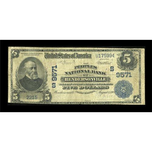 <B>Hendersonville, NC</B></I> - $5 1902 Date Back Fr. 592 <B>The Peoples NB</B></I> Ch. # (S)9571<BR> The rarities just keep on coming from the Kansas City collection, with this note unique to our best knowledge. It comes from a bank which issued Third Charter Date Backs only and liquidated less than six years after it opened. Well circulated but fully intact <B>Very Good,</B></I> hardly a thing of beauty, but where can another example from here be obtained at any price?<BR><I>From The Kansas City Collection.</B></I><BR><BR><b>Shipping:</b> Coins & Currency (<a target="_blank" href="http://www.heritageauctions.com/common/shipping.php">view shipping information</a>)